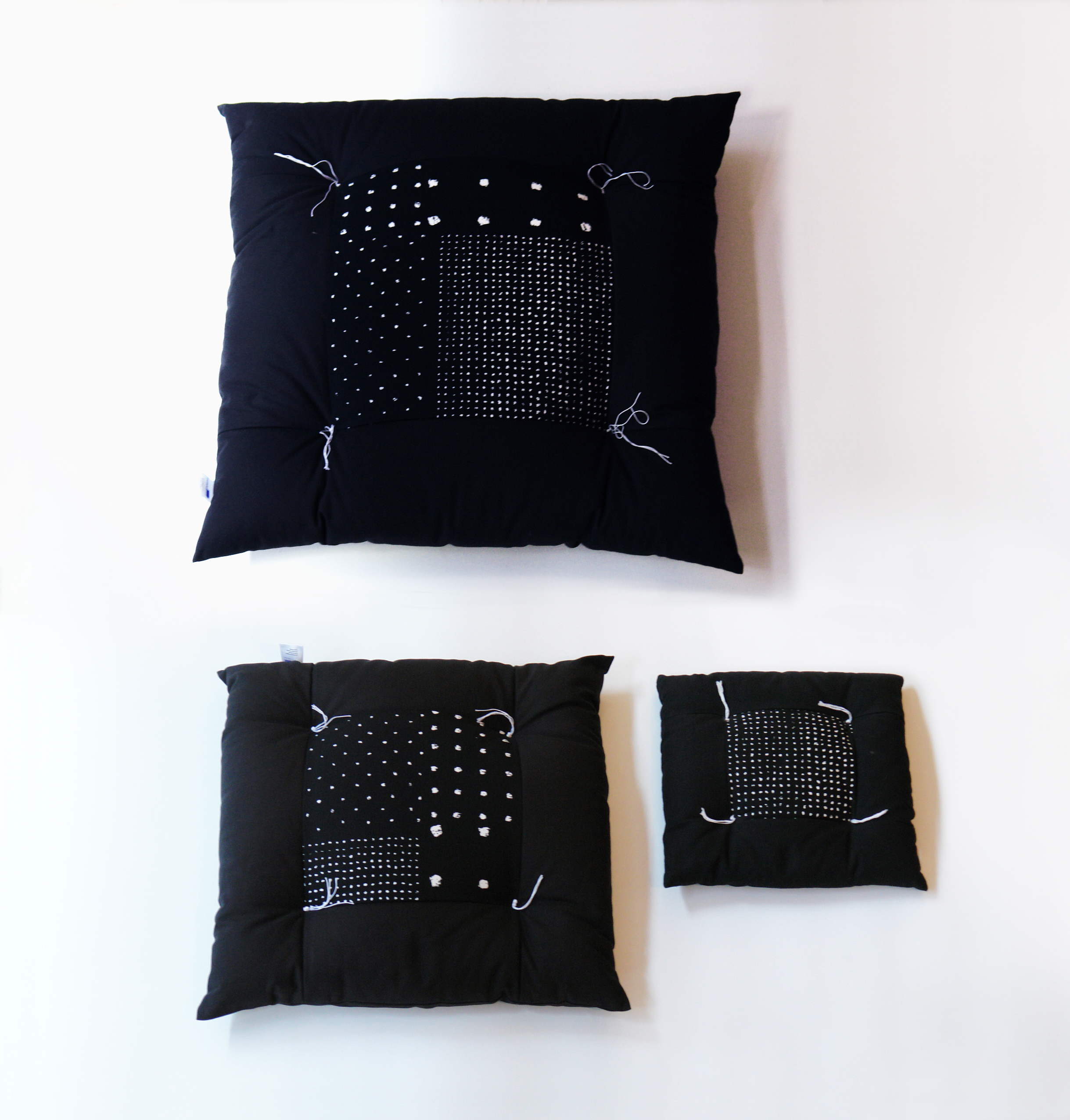 Sitzkissen gefüllt mit Kapok. Rechteckig, bauschig mit Carré (Dessinstoff NOPE) auf 1 Seite. Grundbezug standard: schwarz (oder KOBE farbig oder LINN 0)