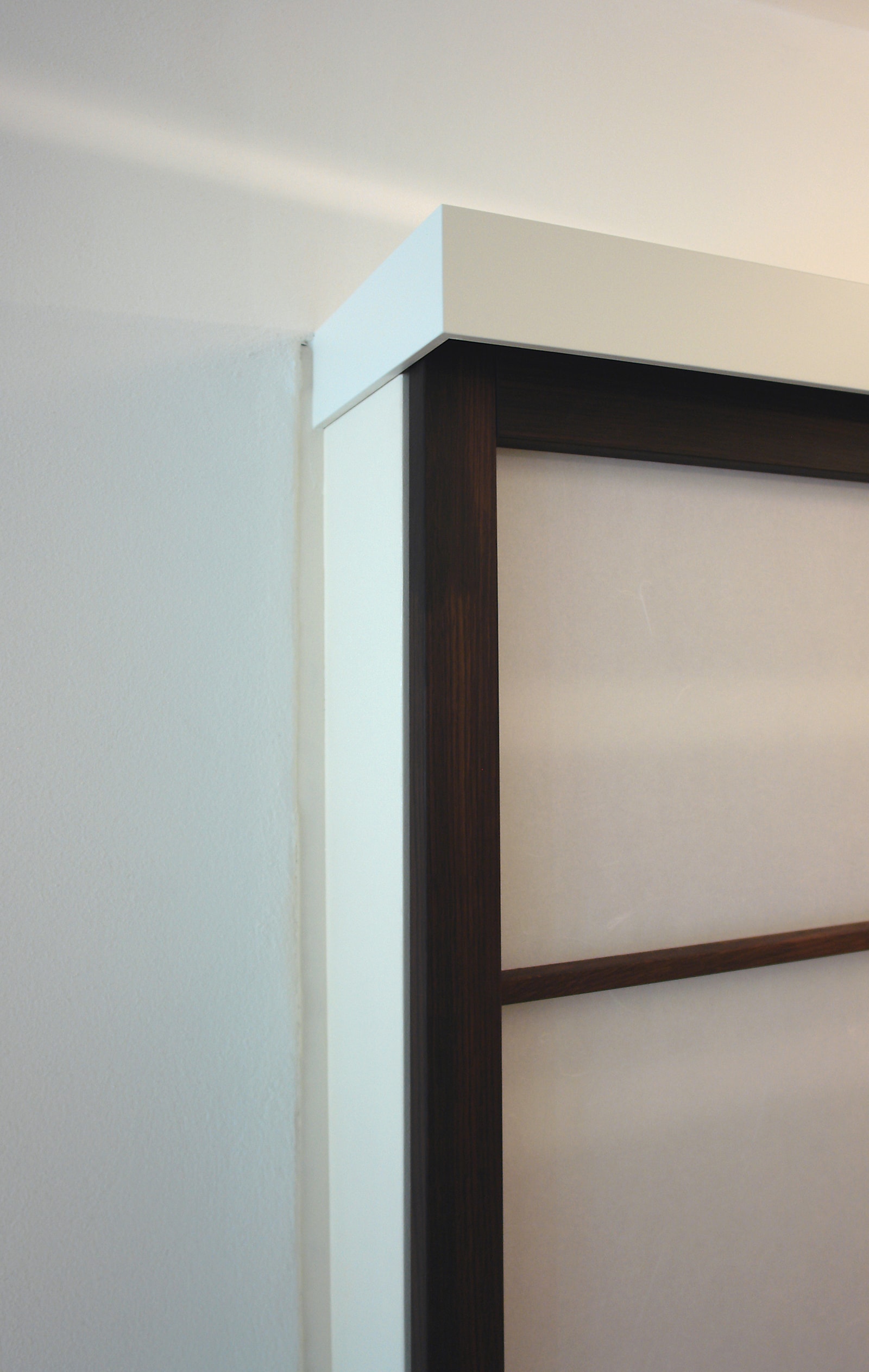 Shoji-Schiebetüren in massiver Eiche. geräuchert und geölt als Front eines bestehenden Garderobenschrankes. Alle Holzteile der Schiebeelemente sind fest verleimt und auf der Rückseite mit Washi-Papier bespannt. Die Konstruktion der Führung und Verkleidung wurde so konzipiert, dass sie sich ’nahtlos‘ in die bestehenden Situation einfügt. So wirkt die Shoji-Front wie ein Bild.