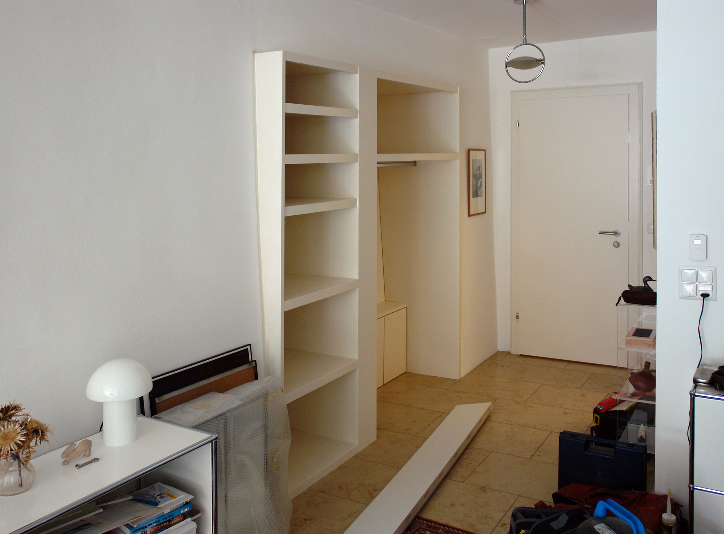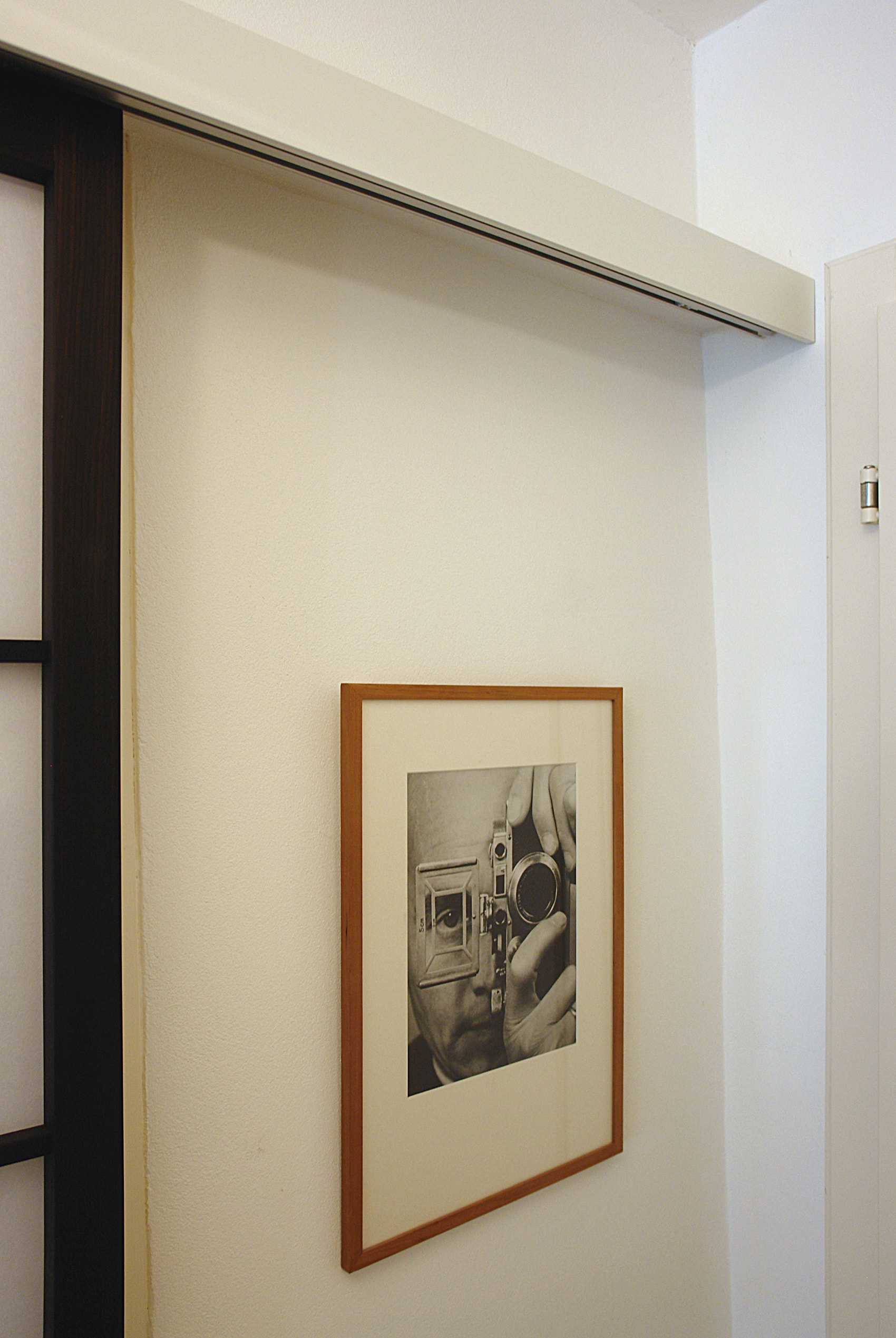Shoji-Schiebetüren in massiver Eiche. geräuchert und geölt als Front eines bestehenden Garderobenschrankes. Alle Holzteile der Schiebeelemente sind fest verleimt und auf der Rückseite mit Washi-Papier bespannt. Die Konstruktion der Führung und Verkleidung wurde so konzipiert, dass sie sich ’nahtlos‘ in die bestehenden Situation einfügt. So wirkt die Shoji-Front wie ein Bild.