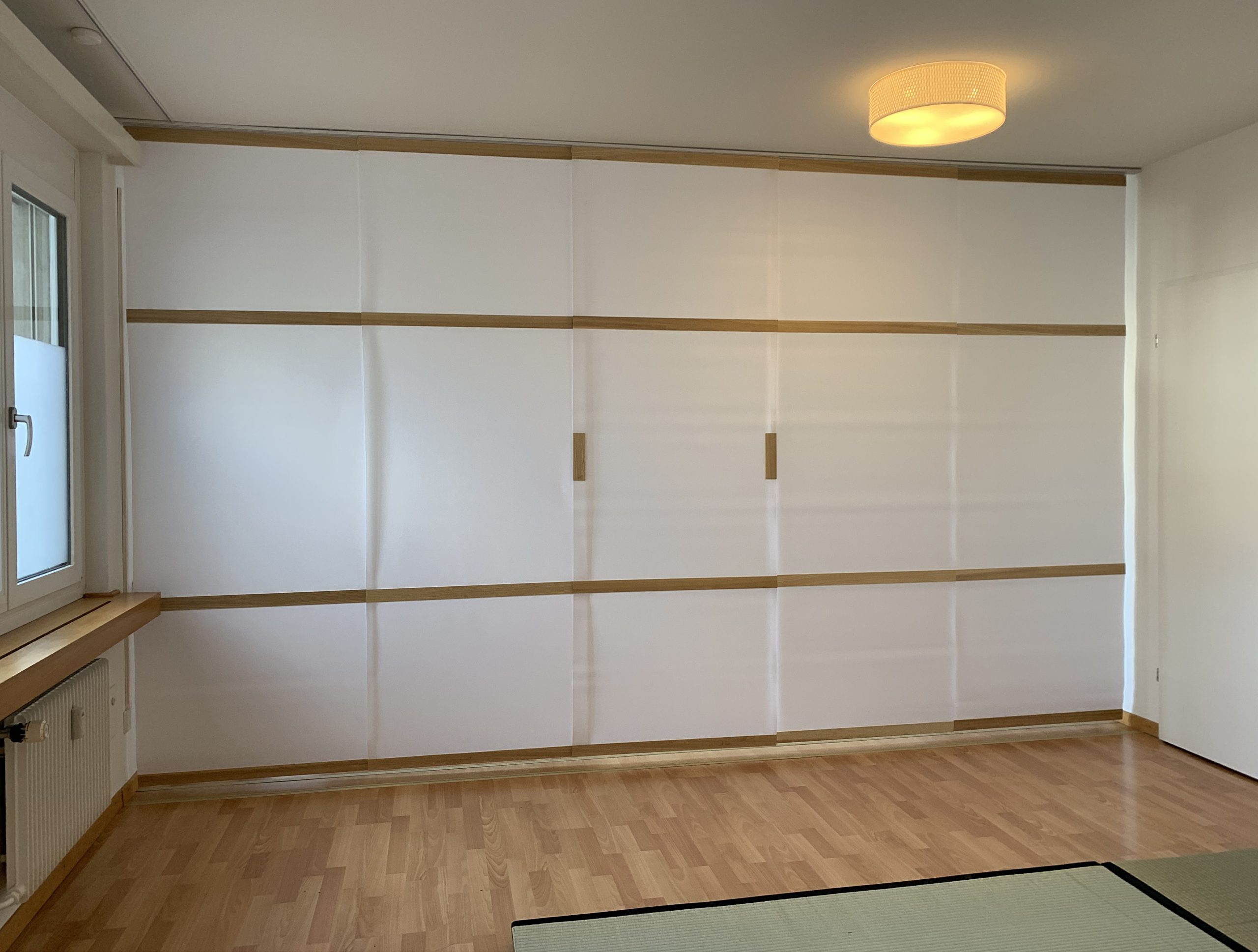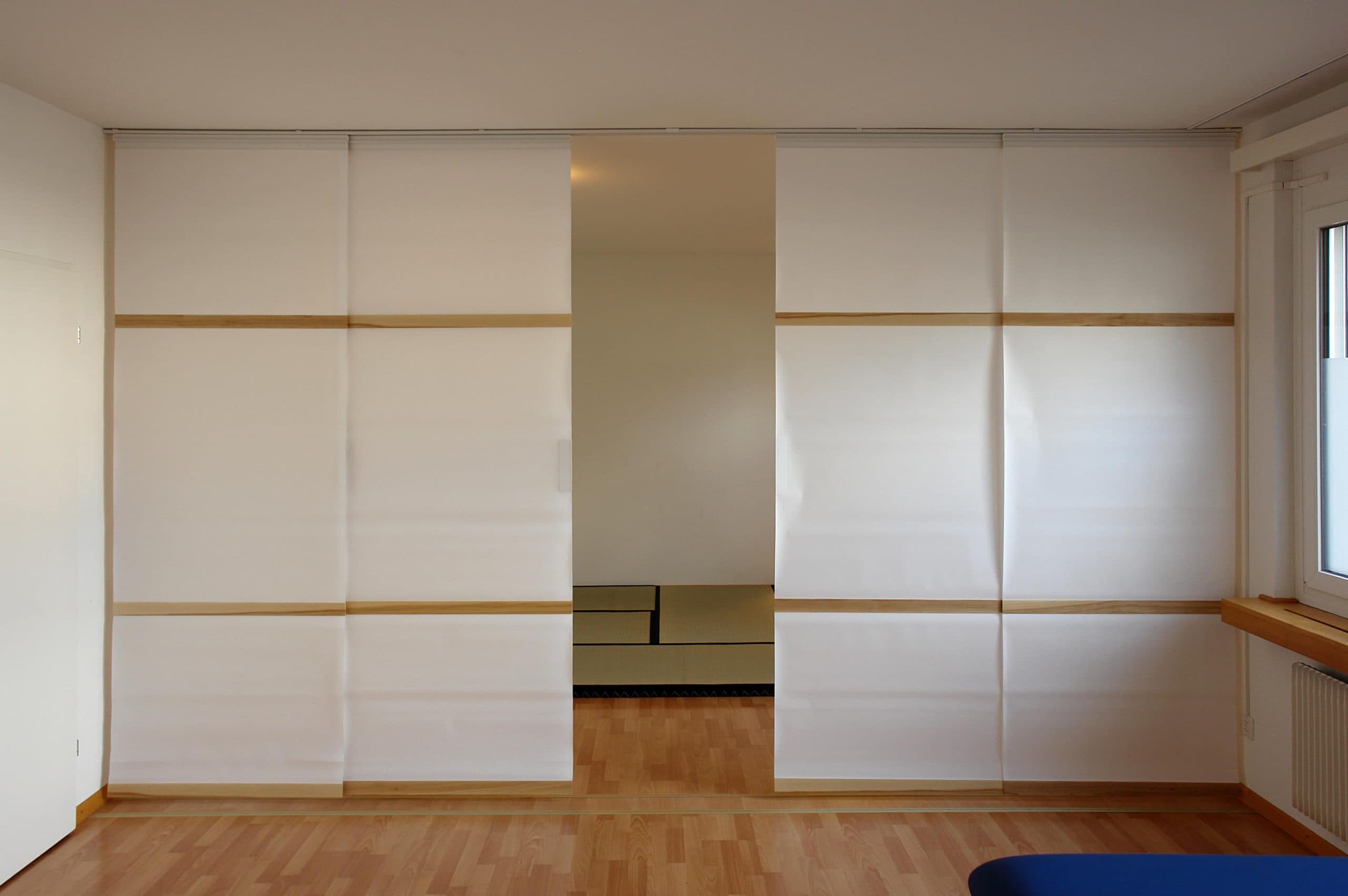 Paneelen mit Washi-Papier und horizontalen Fichten-Lammellen separieren diesen Raum leicht und filigran, sie sind gleichzeitig funktional und ästhetisch. Das mittlere Paneel dient als Durchgangselement. Die komplette Anlage kann jedoch auch ganz nach links oder rechts geöffnet werden.