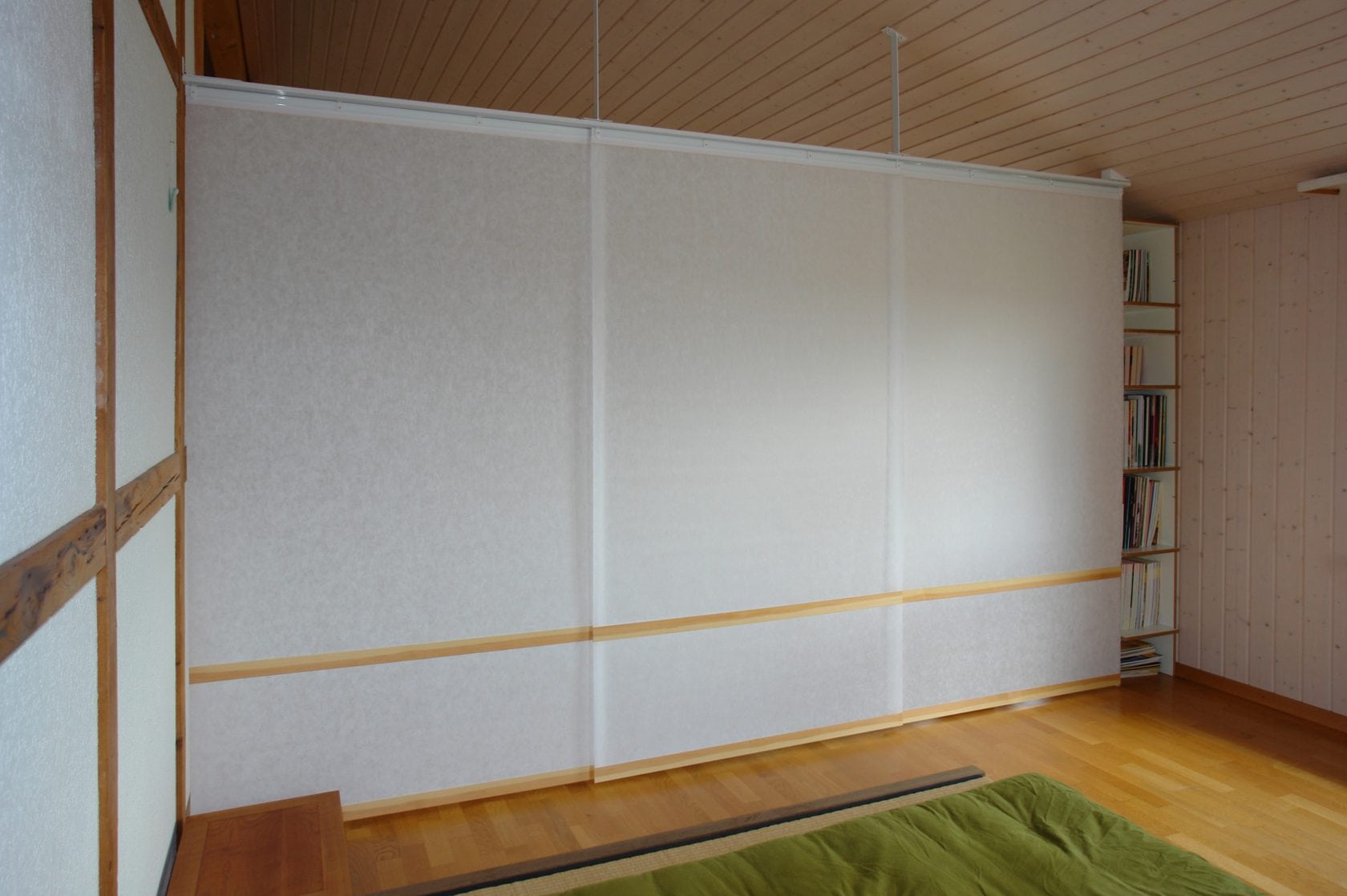 Raumaufteilung von Eingangs- Wohn- und Schlafbereich durch Paneelen mit Washi-Papier. Die Lösung mit den Paneelen ist sehr elegant und leicht und beeinträchtigt das Gesamtraumerlebnis kaum. Im wahren Sinne kommen sie ‚luftig‘ daher, da gegen die Schrägdecke viel offener Raum besteht – dies untersützt zudem die ausgeprägte Transluszenzund des eingesetzten Papiers. Bei beiden Anlagen wurde ein FNP-Regal von Nils Holger Moormann miteingeplant und integriert. Da das obere Führungsprofil bei diesem System ab einer bestimmten Länge nicht mehr selbsttragend ist haben wir bei der grösseren Anlage eine Lösung mit schlanken Metallträgern umgesetzt, welche an der Dachschräge fixiert sind. Die reduzierte Bestückung mit horizontalen Holzlamellen unterstreicht die Leichtigkeit des Erscheinungsbildes als auch die Grosszügigkeit des Raums . Es sind viele Ausführungen für das Papier als auch in textiler Form sowie diverse Holzarten für die Lamellen erhältlich. Die Anordnung wie auch die Anzahl der Lamellen kann frei definiert werden.