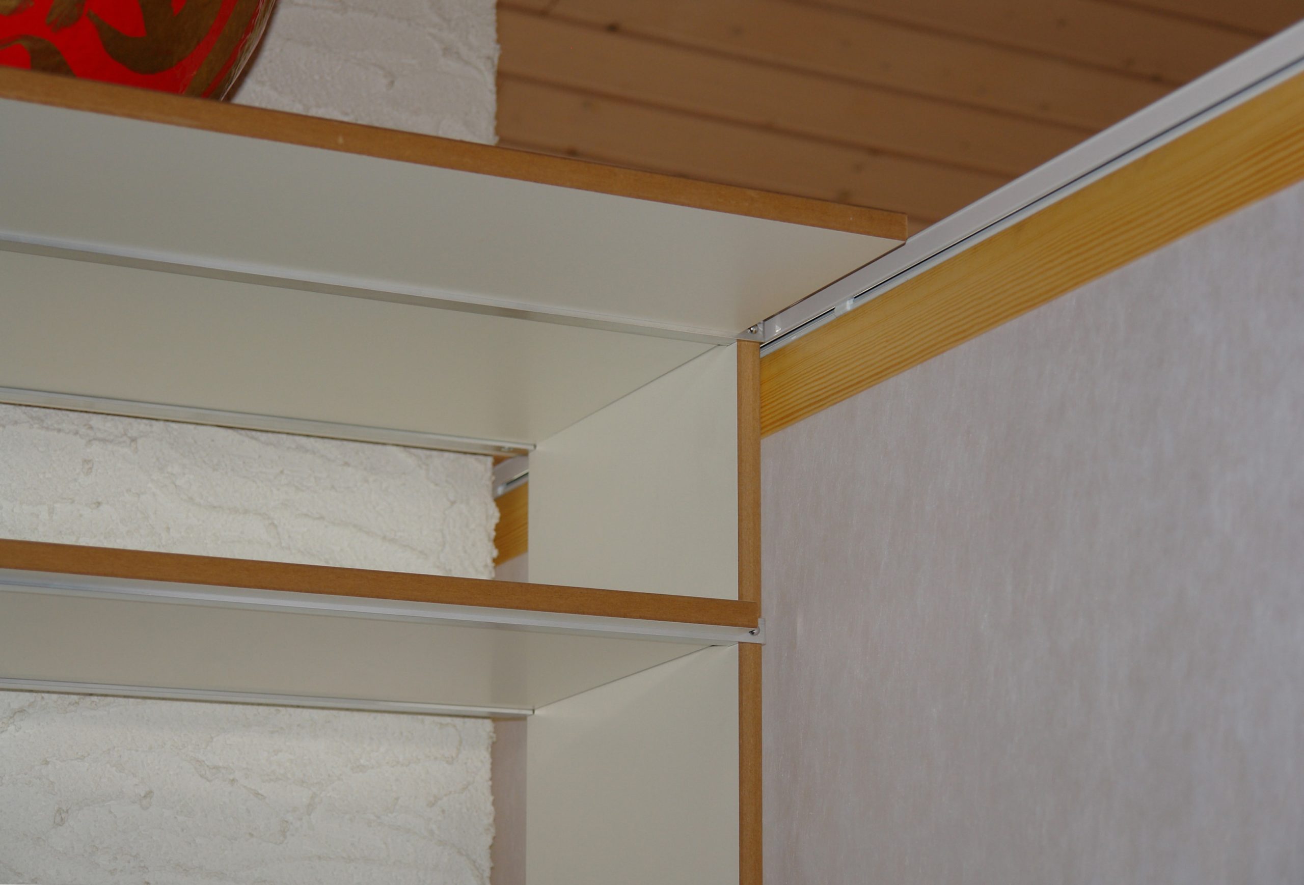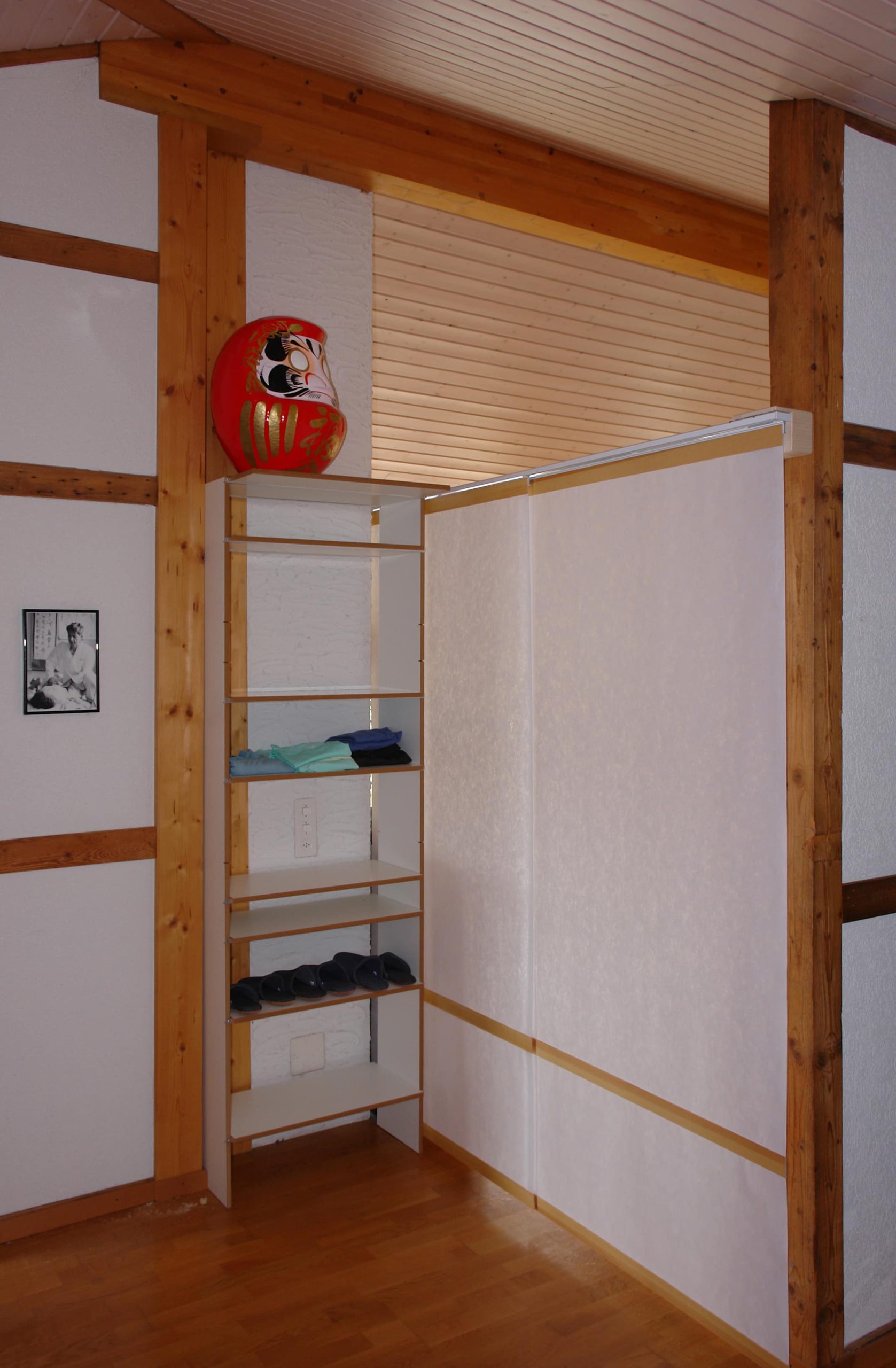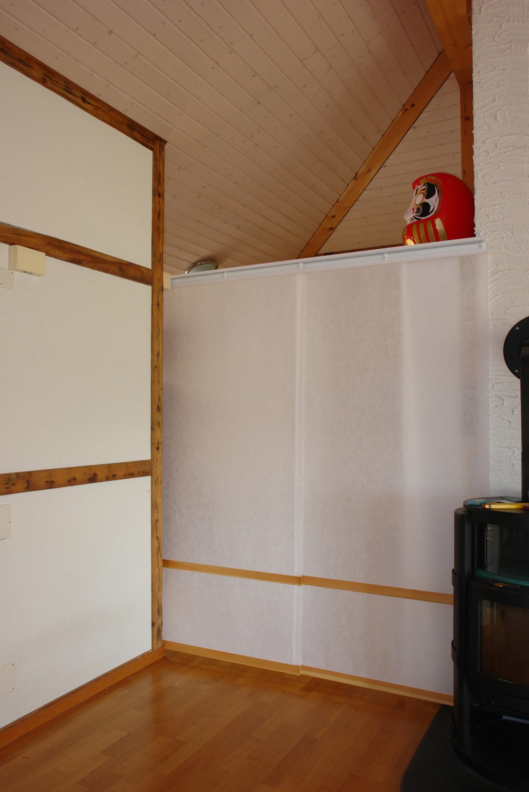 Raumaufteilung von Eingangs- Wohn- und Schlafbereich durch Paneelen mit Washi-Papier. Die Lösung mit den Paneelen ist sehr elegant und leicht und beeinträchtigt das Gesamtraumerlebnis kaum. Im wahren Sinne kommen sie ‚luftig‘ daher, da gegen die Schrägdecke viel offener Raum besteht – dies untersützt zudem die ausgeprägte Transluszenzund des eingesetzten Papiers. Bei beiden Anlagen wurde ein FNP-Regal von Nils Holger Moormann miteingeplant und integriert. Da das obere Führungsprofil bei diesem System ab einer bestimmten Länge nicht mehr selbsttragend ist haben wir bei der grösseren Anlage eine Lösung mit schlanken Metallträgern umgesetzt, welche an der Dachschräge fixiert sind. Die reduzierte Bestückung mit horizontalen Holzlamellen unterstreicht die Leichtigkeit des Erscheinungsbildes als auch die Grosszügigkeit des Raums . Es sind viele Ausführungen für das Papier als auch in textiler Form sowie diverse Holzarten für die Lamellen erhältlich. Die Anordnung wie auch die Anzahl der Lamellen kann frei definiert werden.