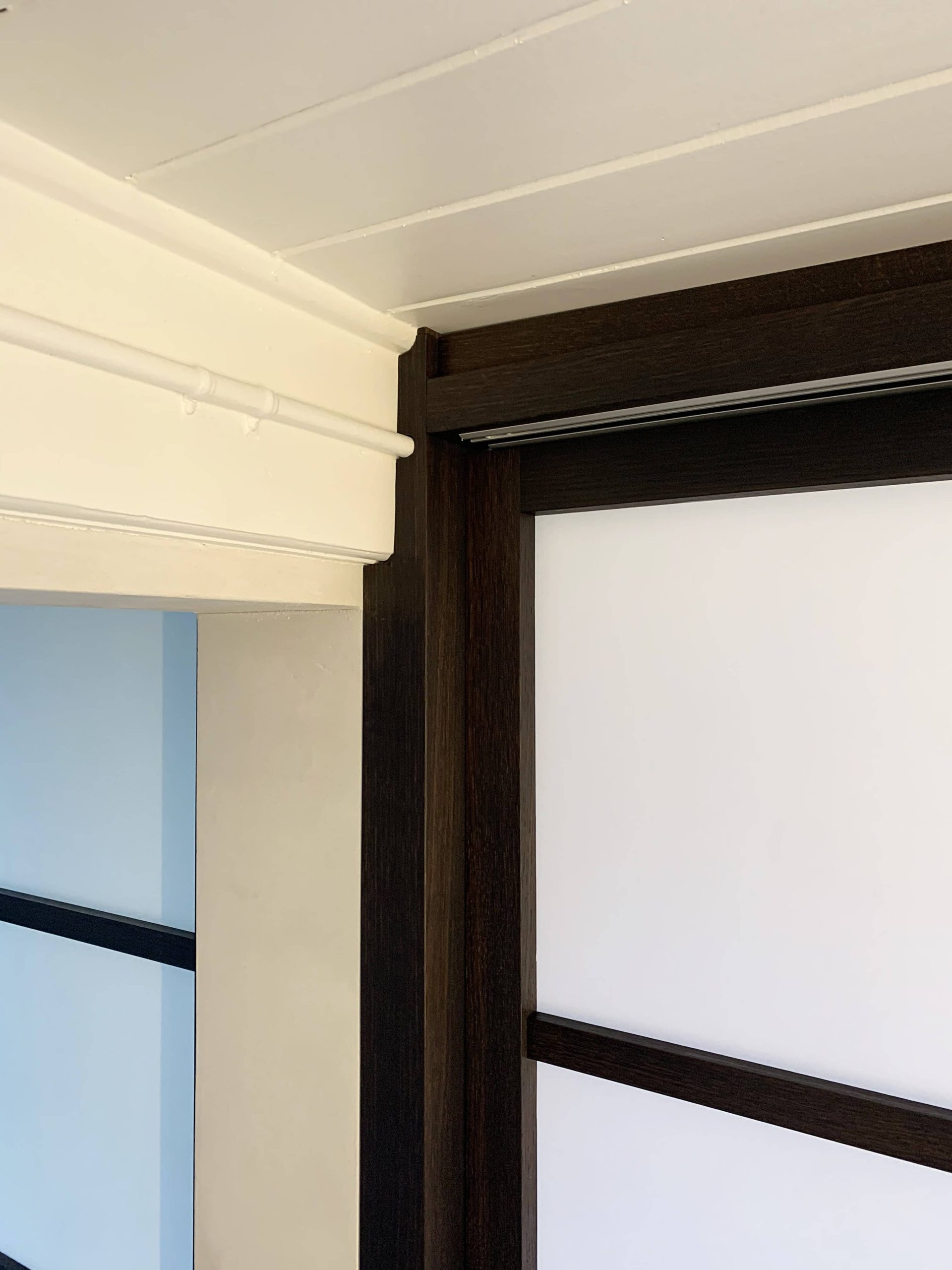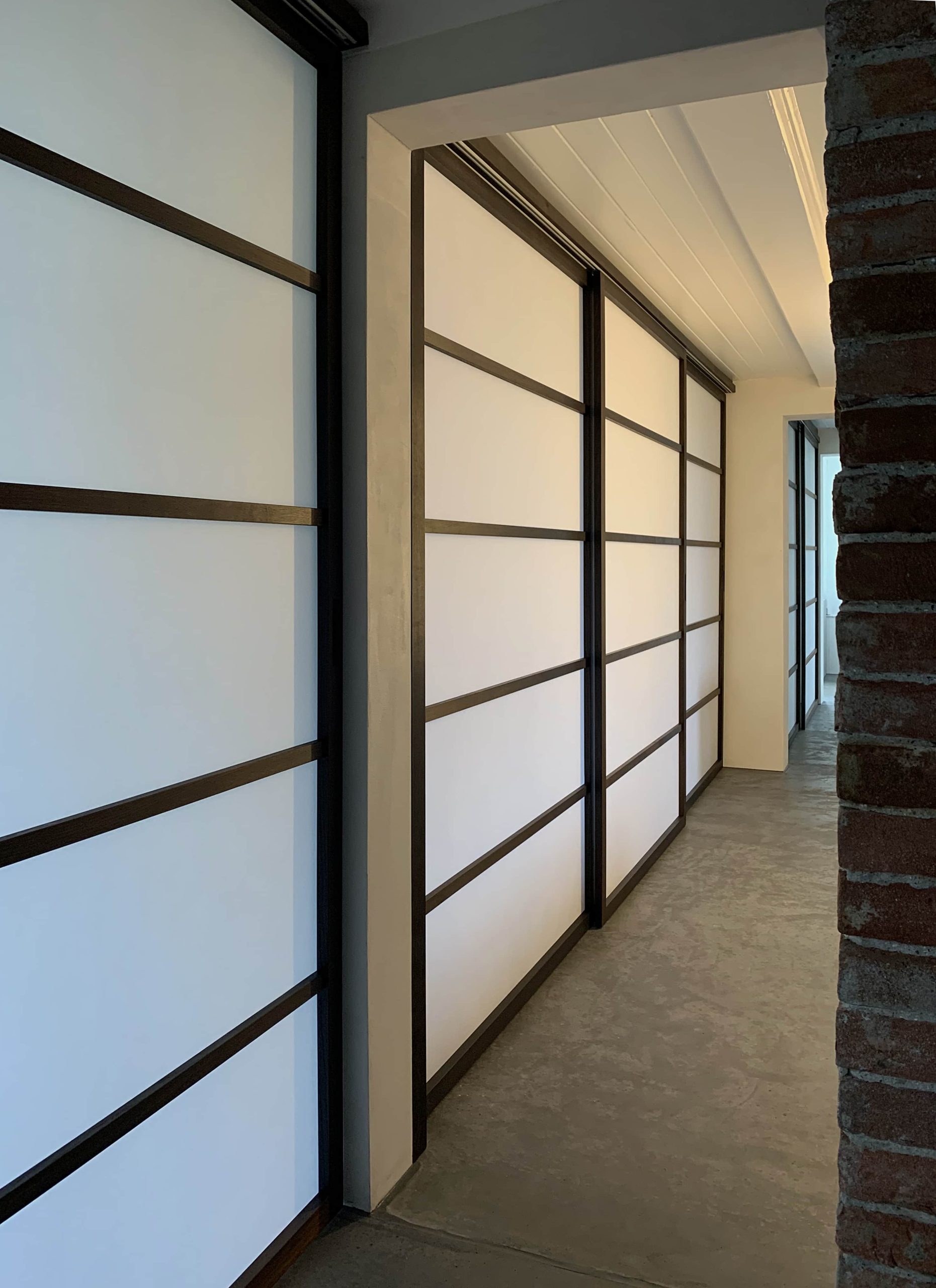 Durch den Einsatz von Shoji-Schiebetüren war es möglich die Raumsituation zu gliedern und neu zu strukturieren. Aufgrund der wunderbaren Transluszenz des Washi-Papiers wirken die einzelnen Räume immer noch verbunden und offen. Die Substanz des renovieren aber doch in die Jahre gekommenen Bauernhauses hat unserem Schreiner bei den Anpassungen alles abverlangt – umso erfreulicher ist das erzielte Resultat !