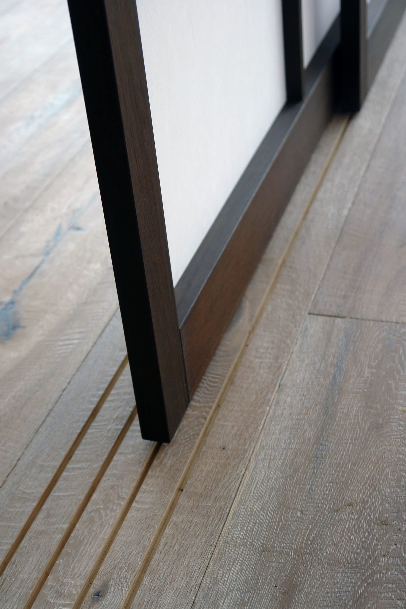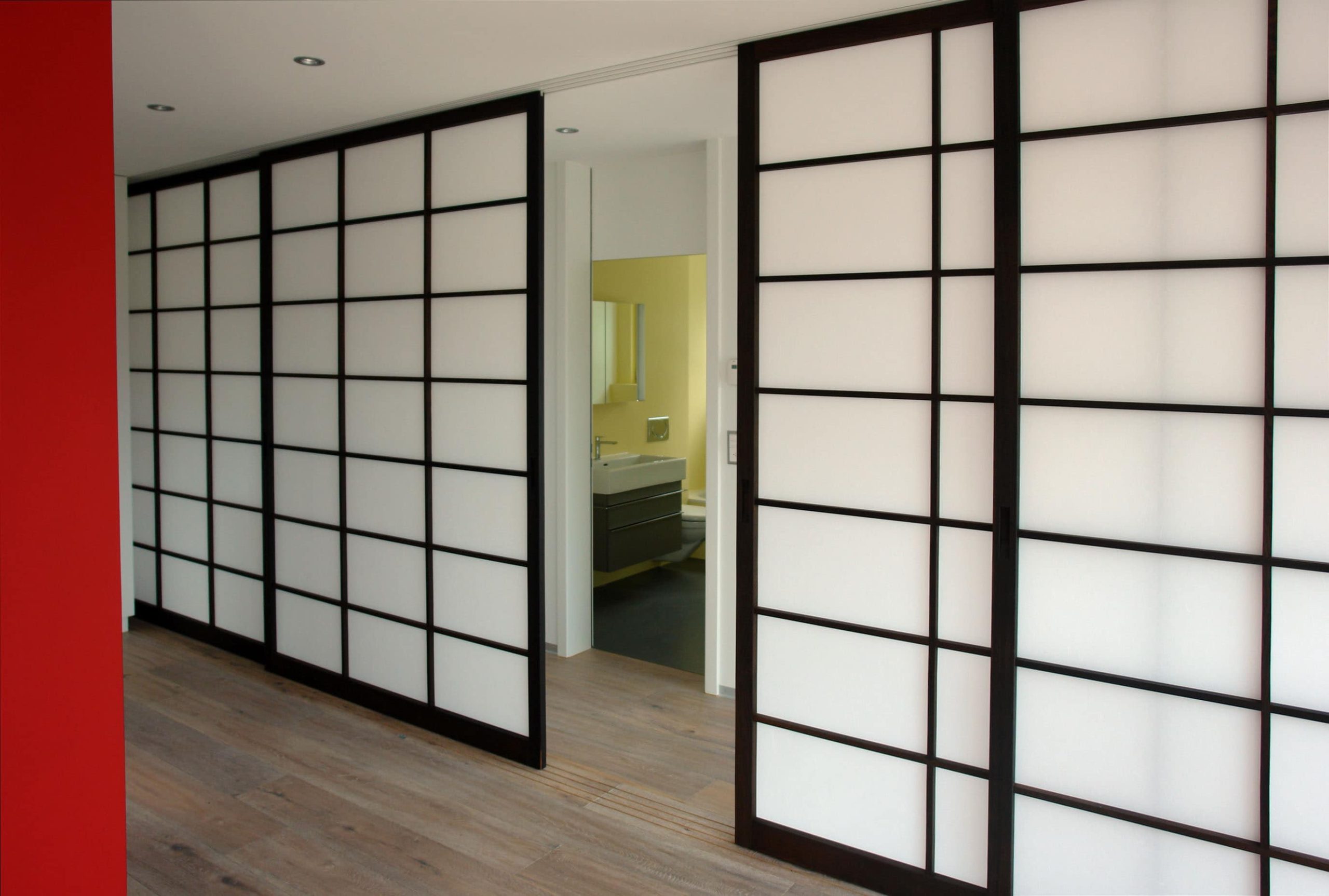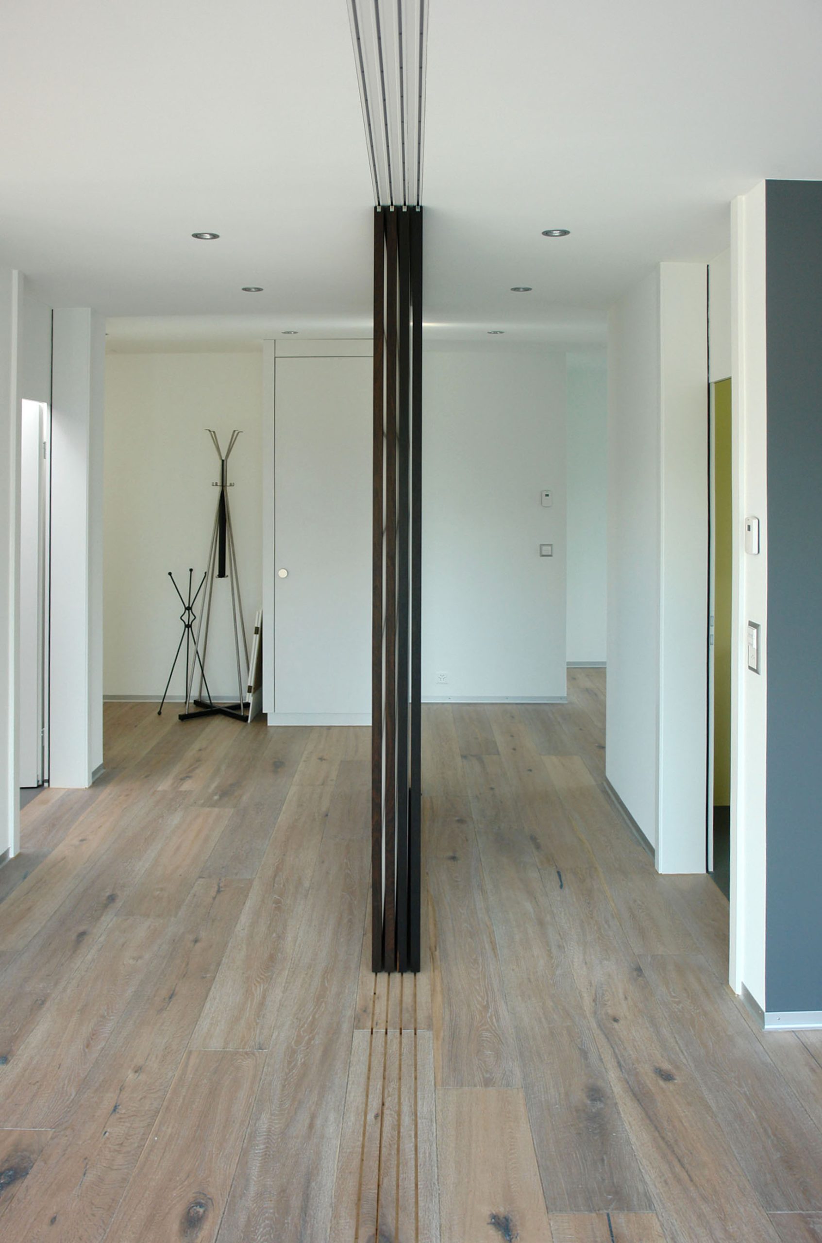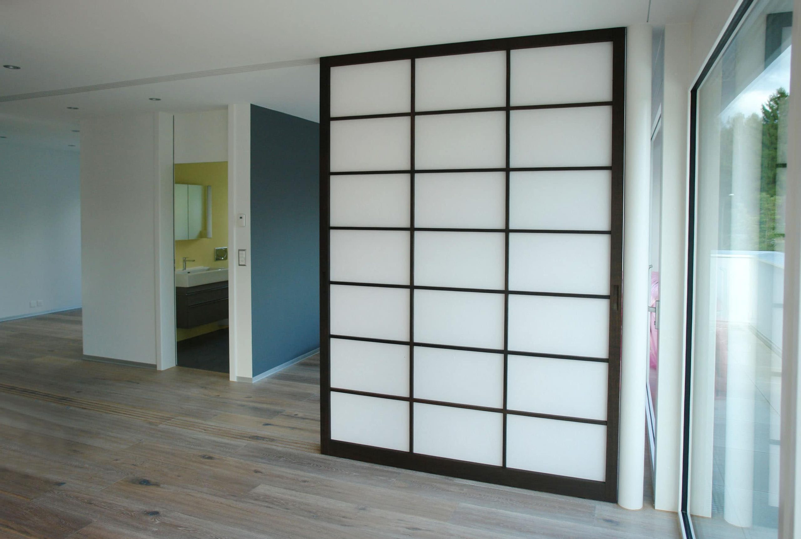 Es war das Bedürfnis der Bauherrschaft, dieses grosszügige und lichtdurchflutete Attikageschoss unterteilen zu können. Mit Shoji’s war diese Idee umsetzbar und durch deren Verschiebbarkeit zudem noch variabel. Um eine möglichst ’saubere‘ Umsetzung zu realisieren wurden die Führungsprofile in die Decke eingelassen und die unteren Führungsnuten direkt in den Parkett gefräst. Holzart: Eiche massiv, wengéfarbig gebeizt und lackiert.
