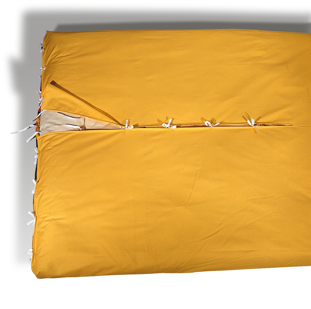 Der Futon-Überzug, welcher den kompletten Futon einfasst, bleibt seiner Erscheinung auch gerollt treu. Umlaufend mit dem gewünschten Stoff eingefasst, ist der Futon auch gerollt schön anzuschauen und geschützt. Auf der Rückseite haben wir einen T-Ausschnitt, Öffnung in der Breite und mittig in der Länge. Je nach Wunsch kann der Ausschnitt definiert werden. Da wir den Futon-Überzug in unserer Manufaktur herstellen, können Stoff, Farbe wie auch die Bändel bestimmt werden. Ästhetische Ausarbeitungen wie Mittelstreifen oder Carré mit Dessin-Stoff verhelfen dem Futon-Überzug zu einem einzigartigen Erscheinungsbild.