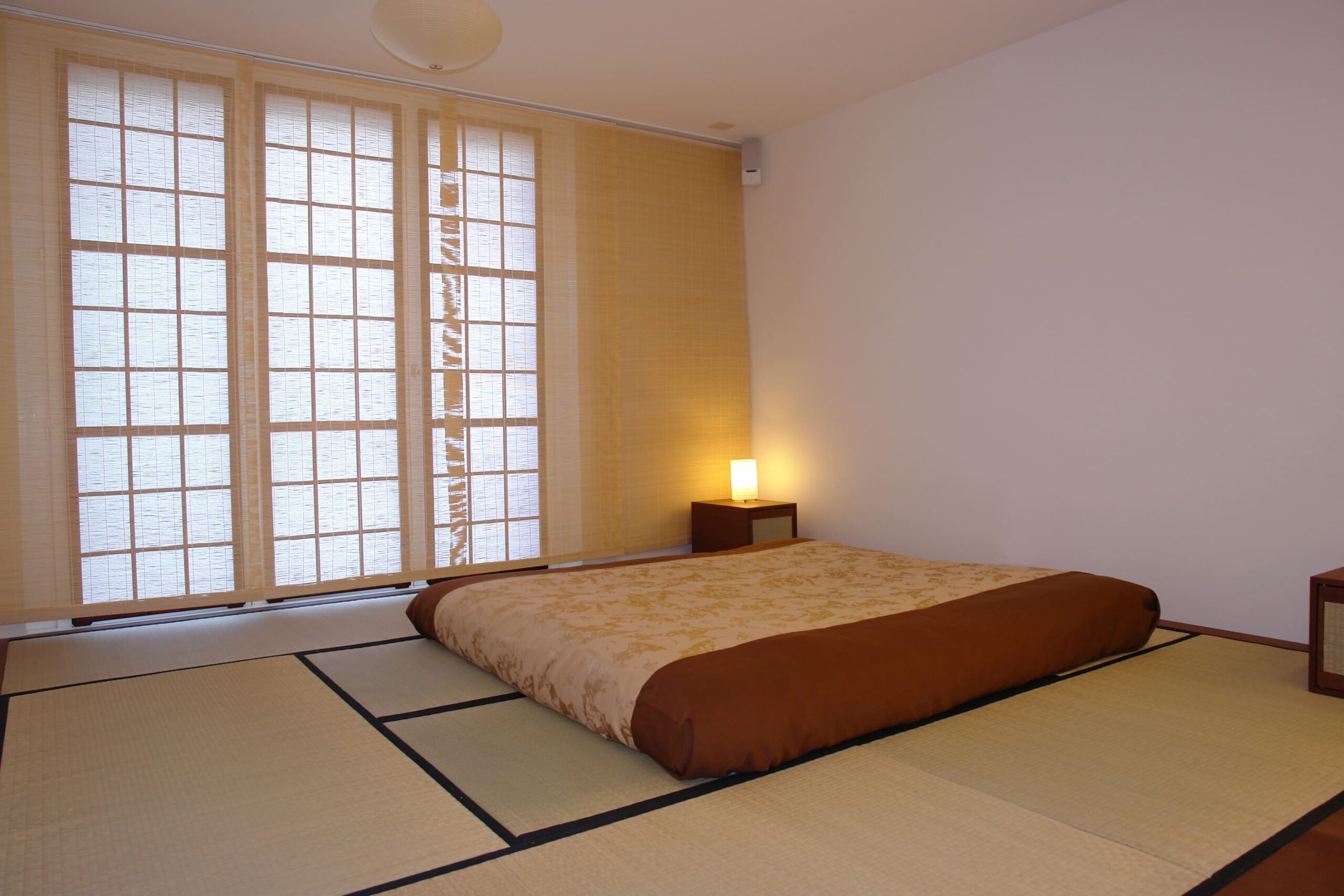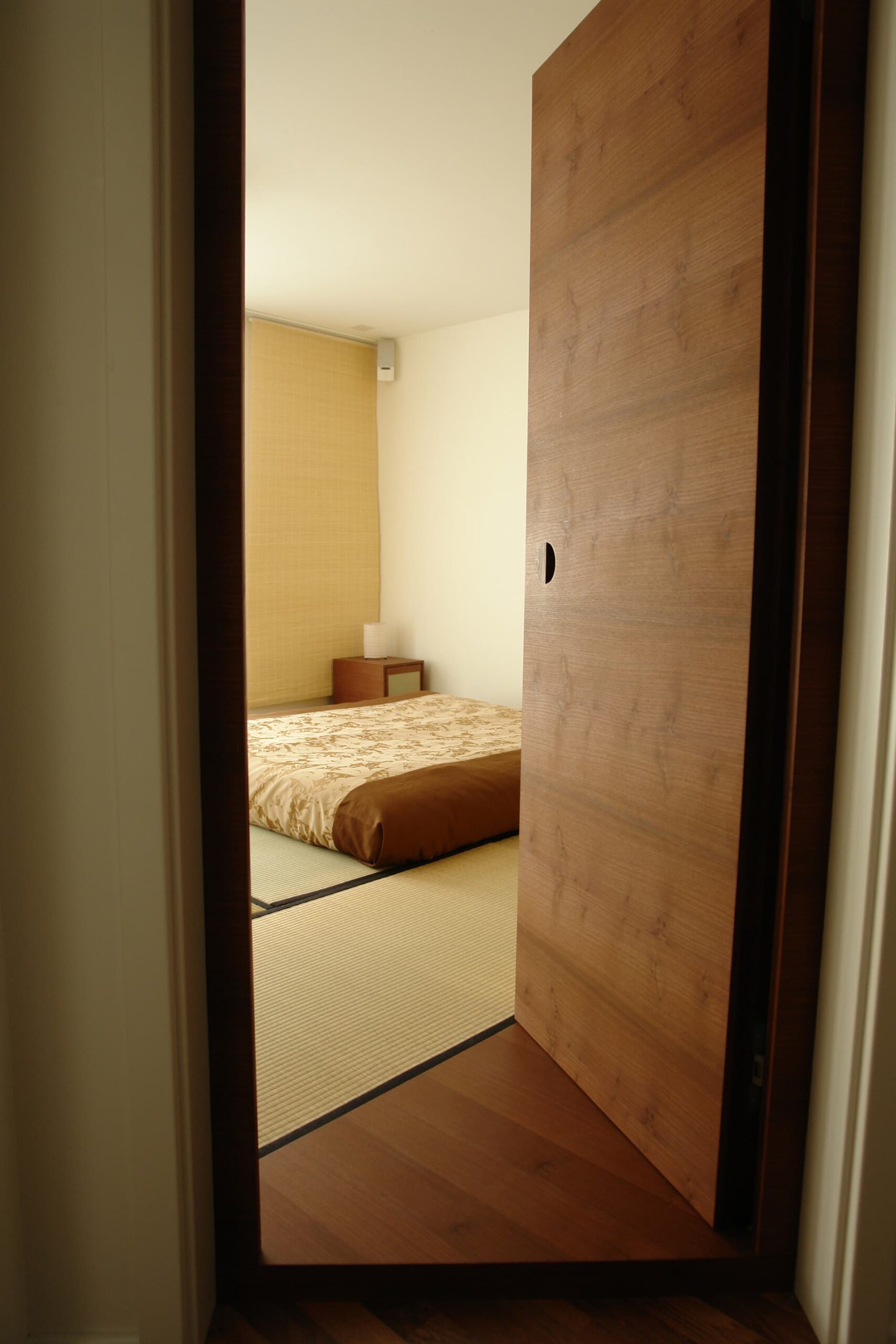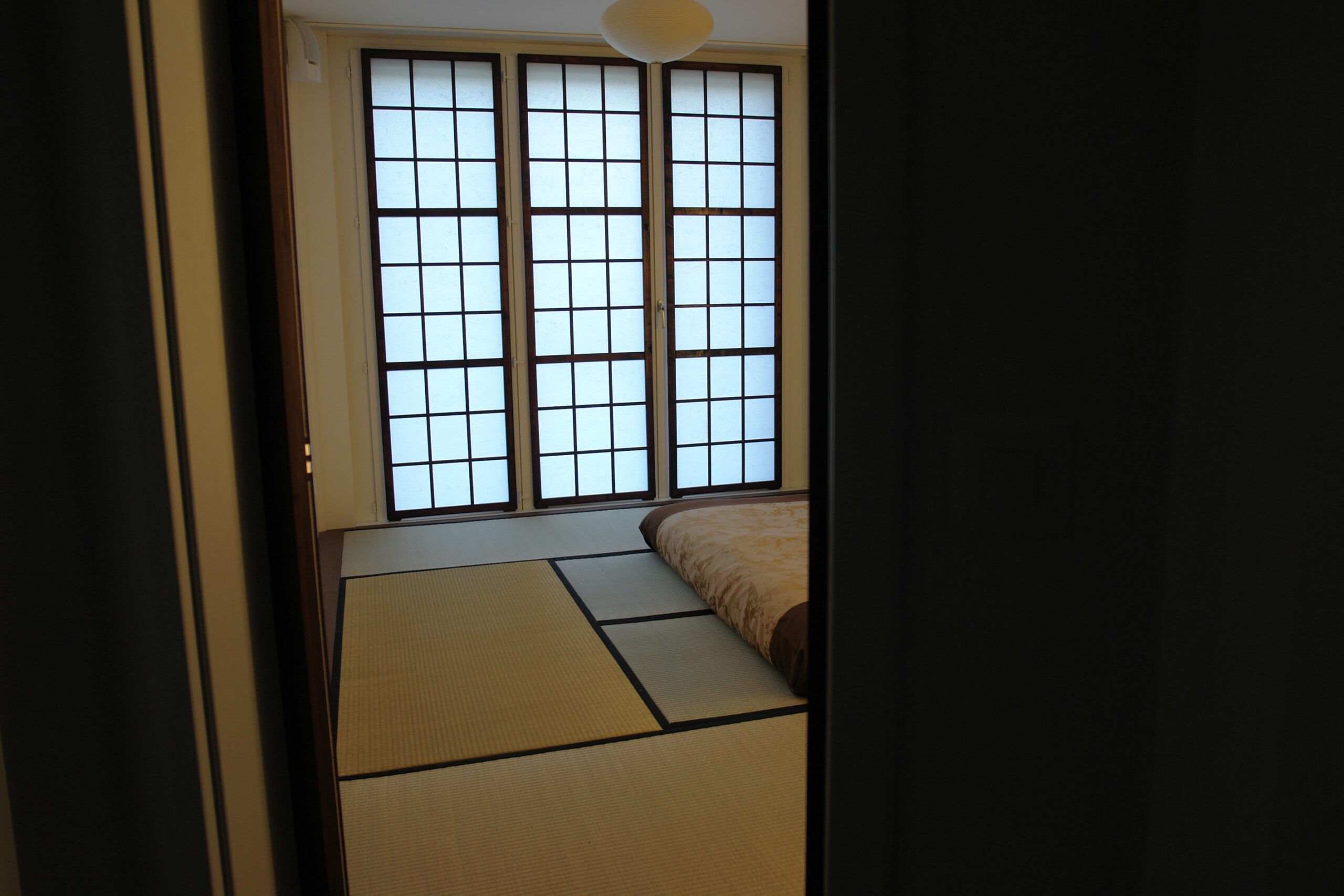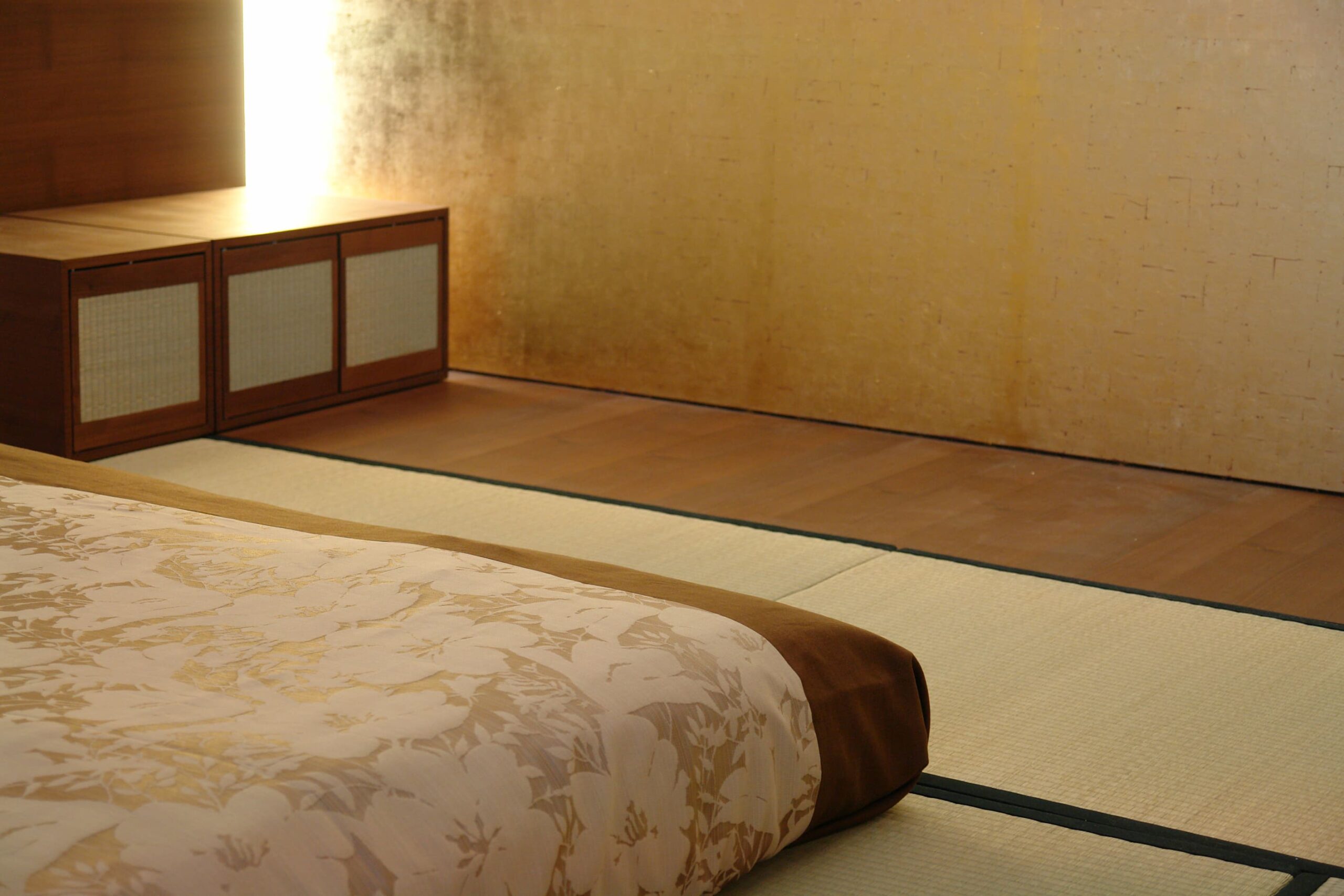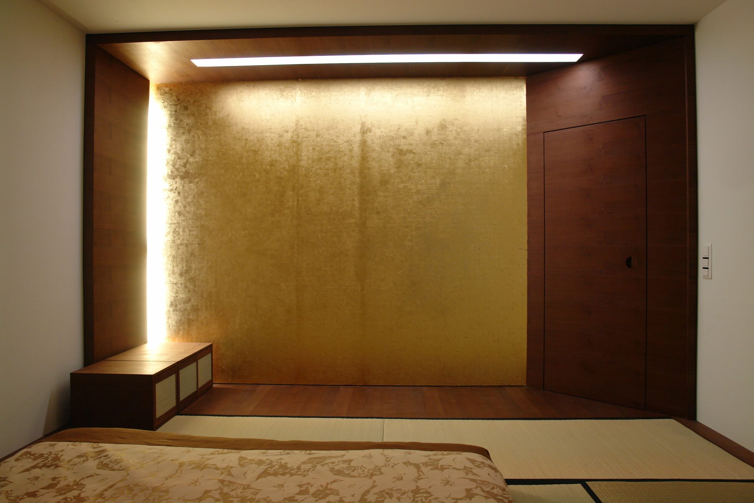 Dieses Zimmer wurde durch uns komplett ausgebaut – alles auf Mass und Wunsch des Bauherrn: fensterseitig vorgehängte Shoji’s mit Schiebepaneelen aus Bambusstächenmatten – Futon mit Jeté de lit und Nachttisch – rückseitig tokonomaähnlich ausgebildet mit Rückwand in Blattgold und indirekter, dimmbarer Beleuchtung – tiefes Möbel mit Dreh-Schiebetüren – Eingangstüre mit speziell ausgestalteter Griffmuschel. Alle Holzelement in Akazie, gedämpft und geölt.