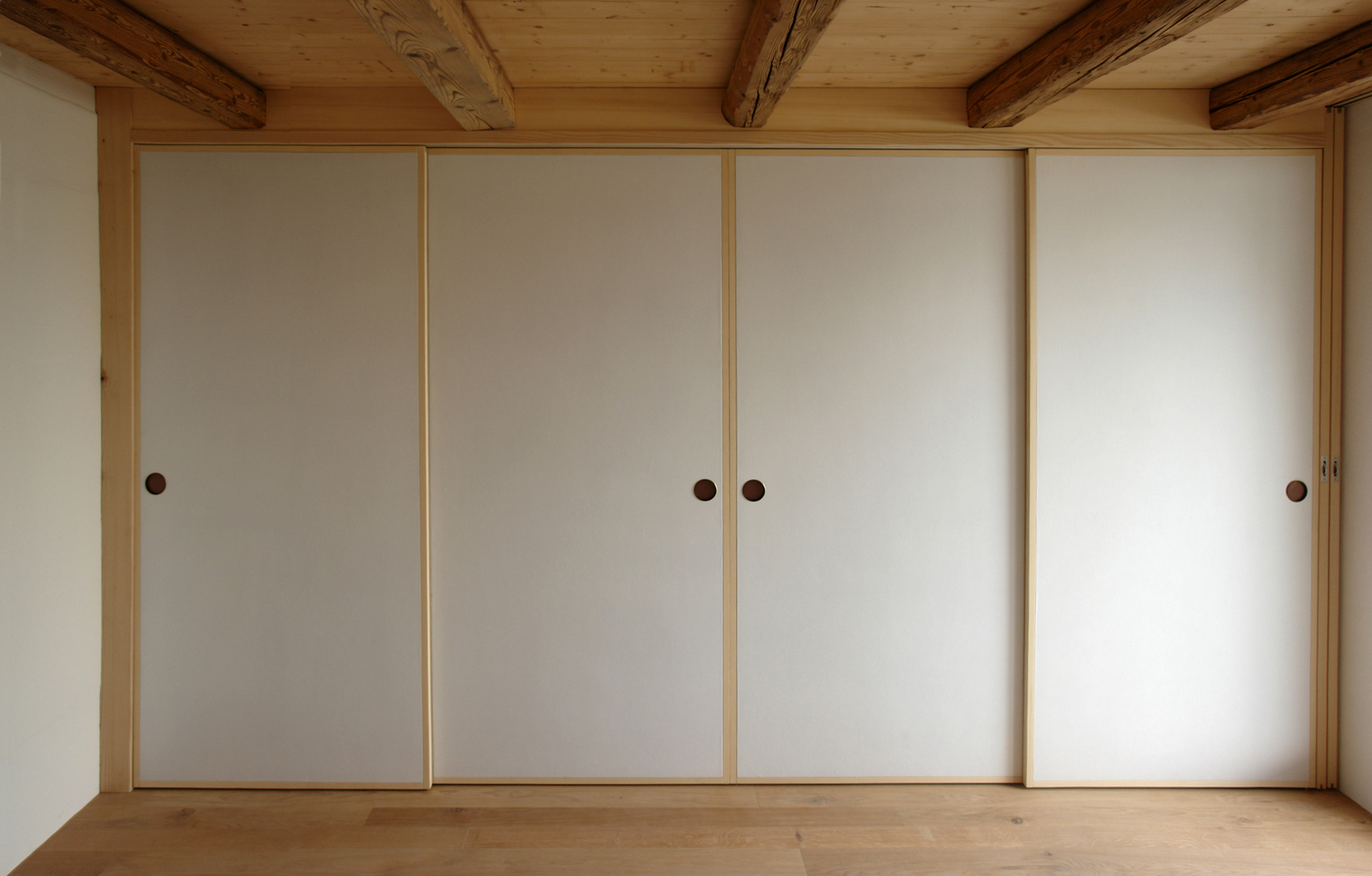 Dieses Nebenzimmer des Dojo’s mit Ausblick auf den Japanischen Garten wurde als Raum der Erholung, Meditation und für Einzelgespräche geplant. In die bestehende Bausubstanz haben wir passgenau Fusuma-Schiebetüren und Shoji’s eingebaut als auch die Bodenebene ergänzt und mit Tatamis ausgelegt. Die Holzwahl lag bewusst auf schlichter Fichte, roh belassen.