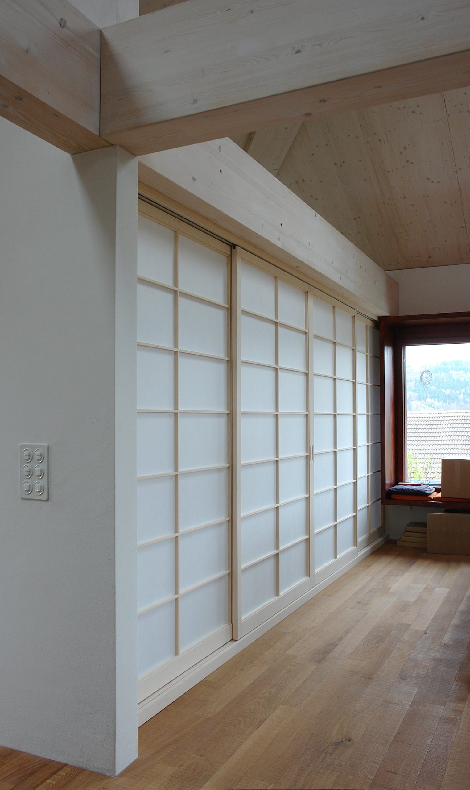 Im Rahmen einer umfassenden Haussanierung durften wir diesen ‚Raum im Raum‘ planen und realisieren. Die Shoji’s sind in Esche massiv, geölt mit weissen Farbpigmenten ausgeführt und für die Bespannung haben wir unser Standard-Washi-Papier mit Fasereinschlüssen verwendet. Die Bodenfläche ist mit Tatami-Matten ausgelegt.