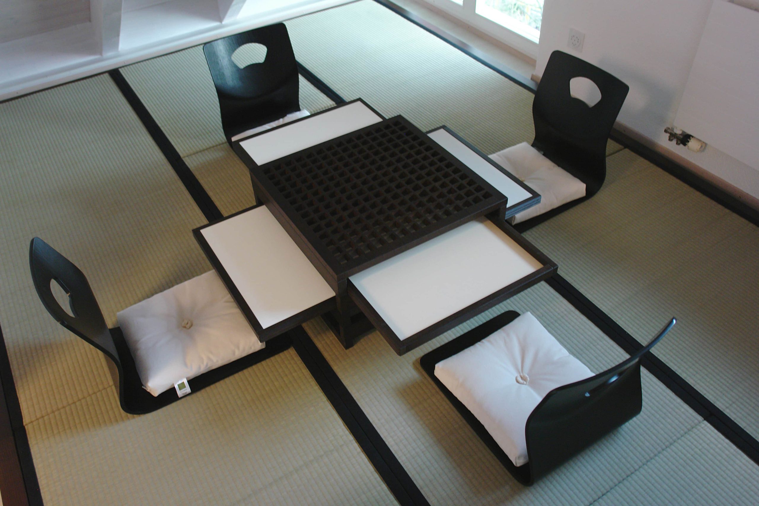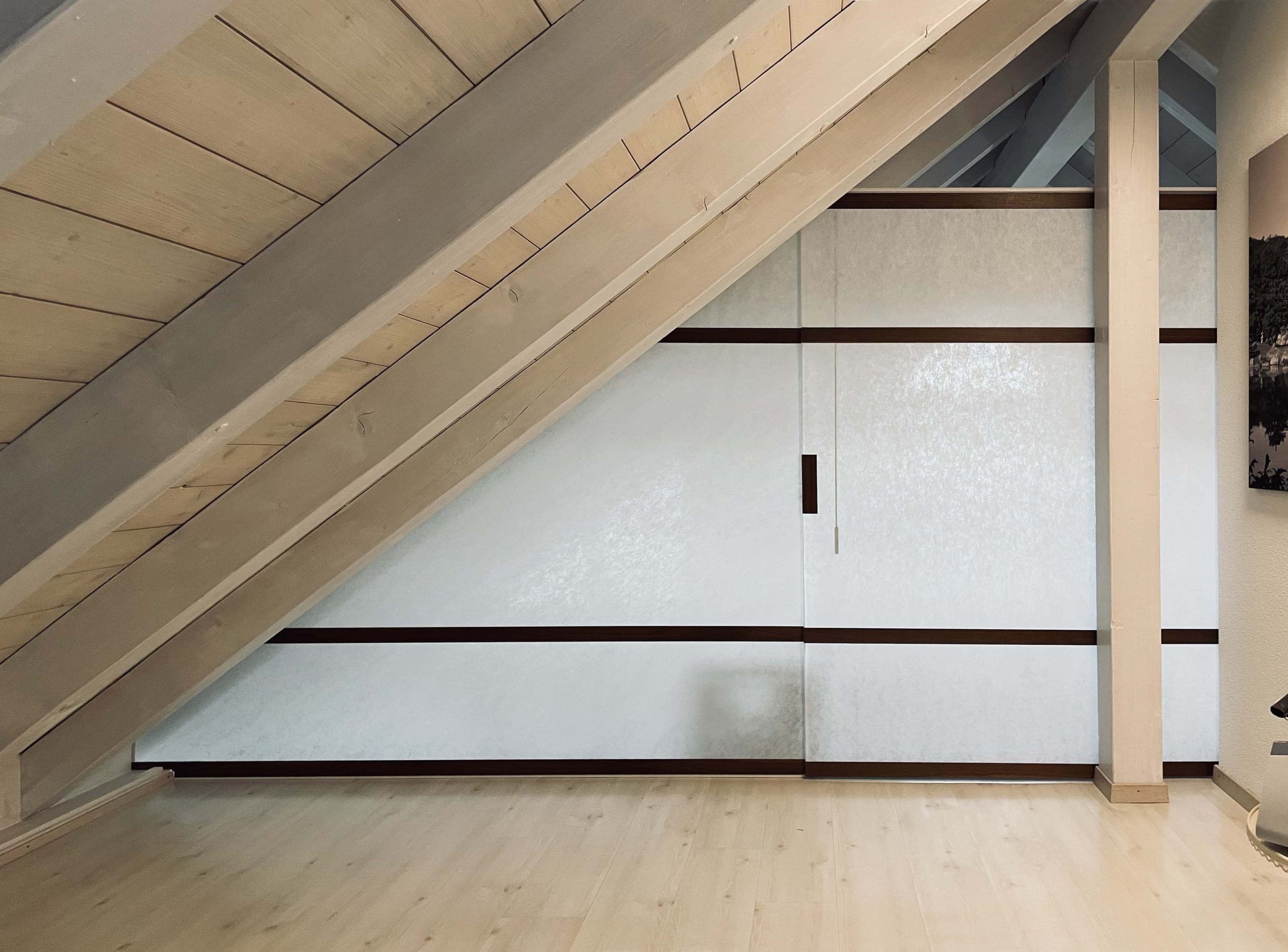 Eintauchen in eine andere Welt – ein Rückzugsort – Meditation – eine Teezeremonie oder einfach sein. Hinter den Washi-Paneelen mit horizontalen Nussbaum-Lamellen öffnen sich neue Horizonte. Das Paneelsystem ist äusserst vielseitig und kann individuell und auf Mass eingesetzt werden. Das Washi-Papier wurde vor Ort eingeschnitten und der Dachschräge angepasst. Das Durchgangselement kann innen mit dem Schleuderstab und von aussen an der Griffleiste bewegt werden. Der Tetra-Tisch von Sculptures Jeux mit den Formholz-Sitzen – Zaishu – und Kisssen runden das Konzept perfekt ab. Die Tatami-Fläche ist umrandet mit einem Tatami-Rahmen aus Massivholz.